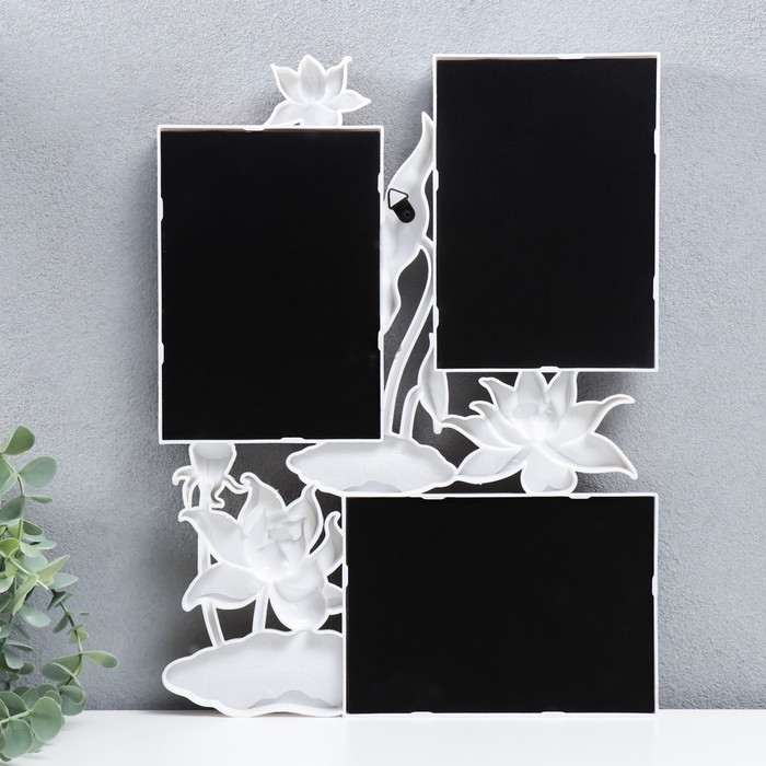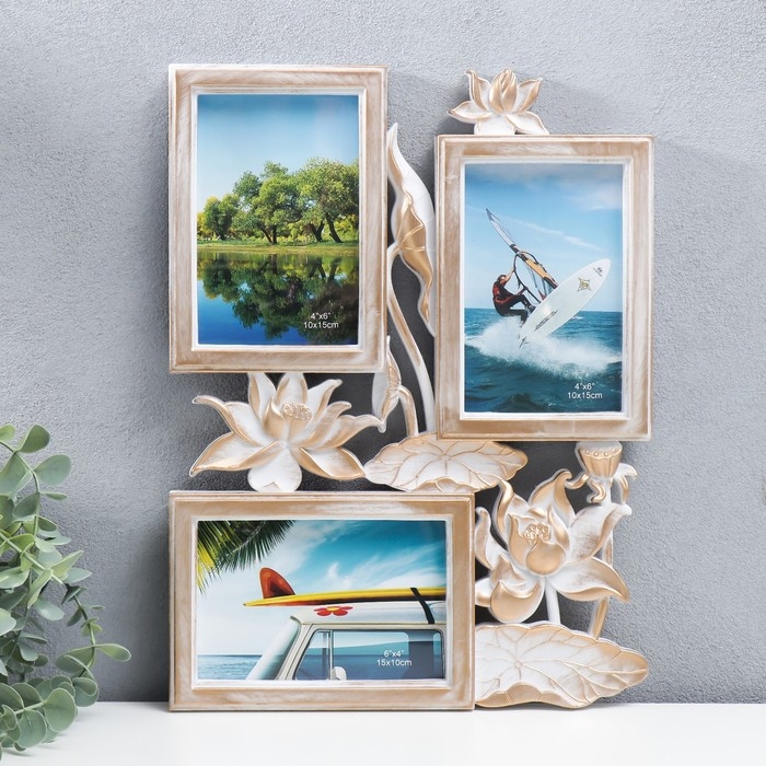Фоторамка пластик на 3 фото 10х15 см "Лотосы" золотисто-белый 36х27 см