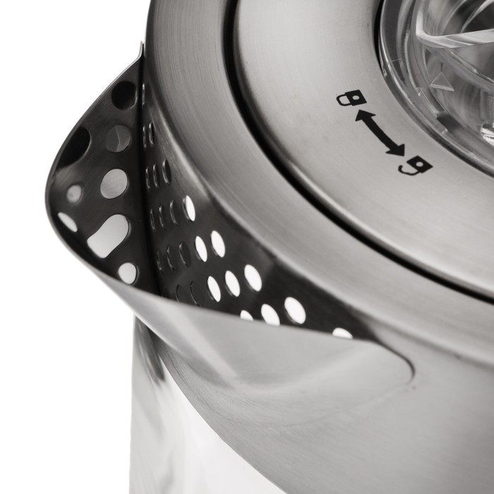Резервуар для воды выполнен из прочного стекла, а корпус — из жаропрочного пластика и нержавеющей стали.