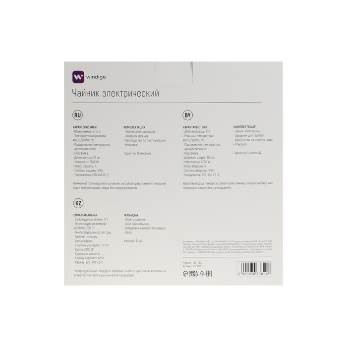 Чайник от Windigo прекрасно подойдет для дома, для офиса или дачи. Надёжный переключатель, удобная кнопка открывания крышки, большая ручка, стильная подсветка сделают обращение с бытовым прибором комфортным и долговечным!