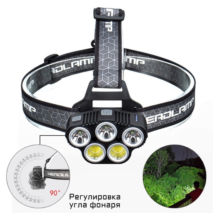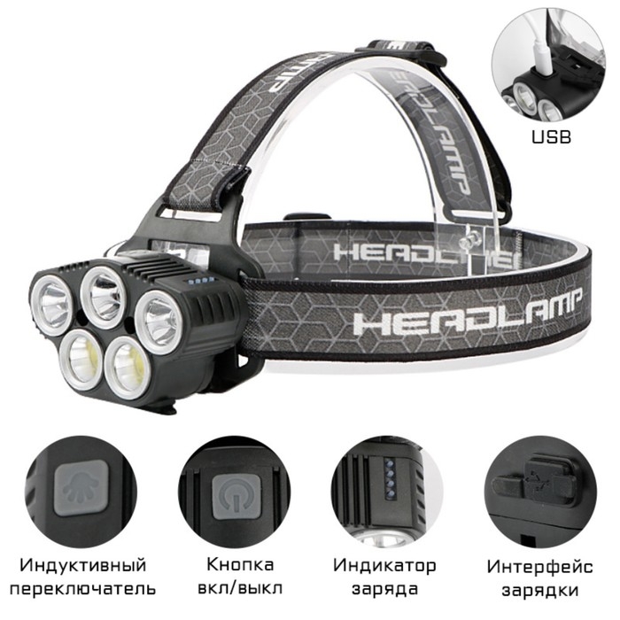 Фонарь налобный аккумуляторный, 1000 мАч, 5 Вт, 3 LED, 4 режима, USB