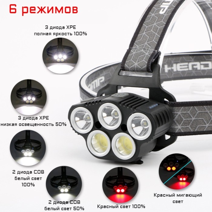 Фонарь налобный аккумуляторный, 10 Вт, 1000 мАч, 200 лм, LED, IPX3
