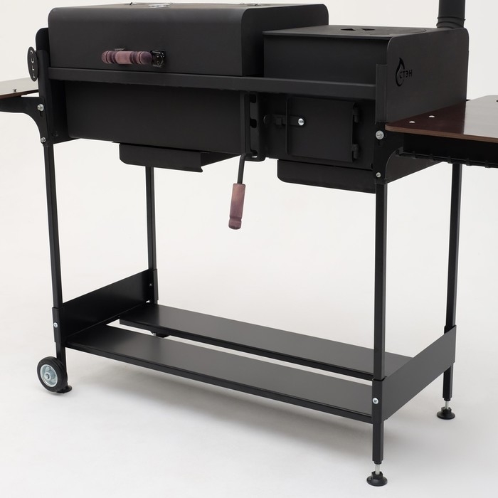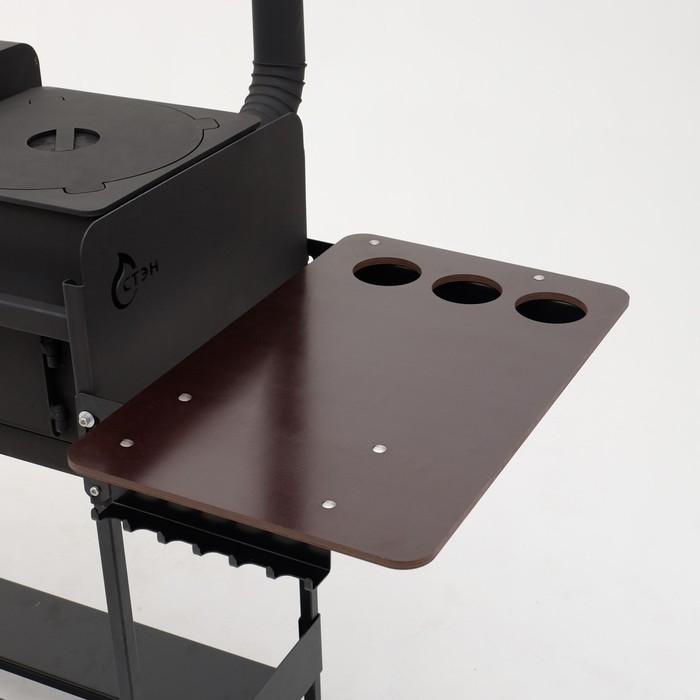 Чаша мангала и печь оснащены выдвижными зольниками.Справа и слева располагаются откидные столики . Внизу – полки.
