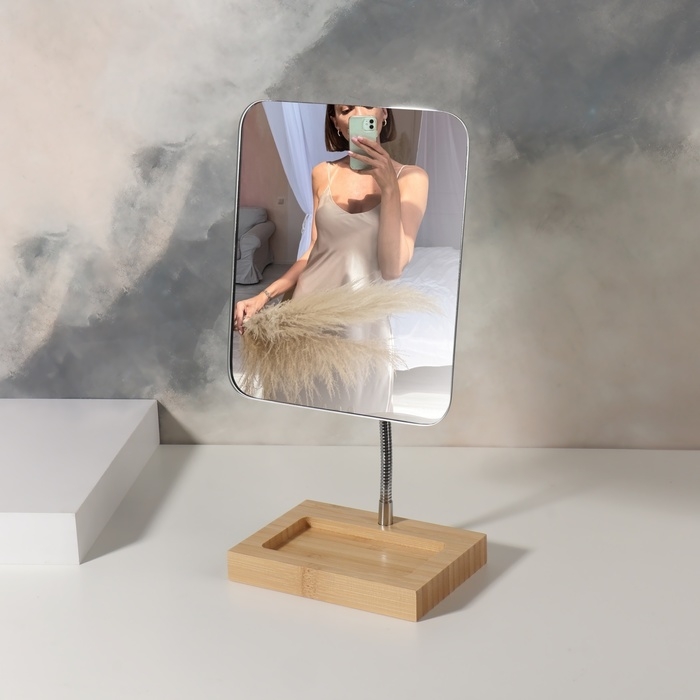 Изящное зеркало на подставке из бамбукового дерева — это украшение для туалетного столика. Оно поможет вам ежедневно следить за собой, наносить макияж и поправлять причёску.