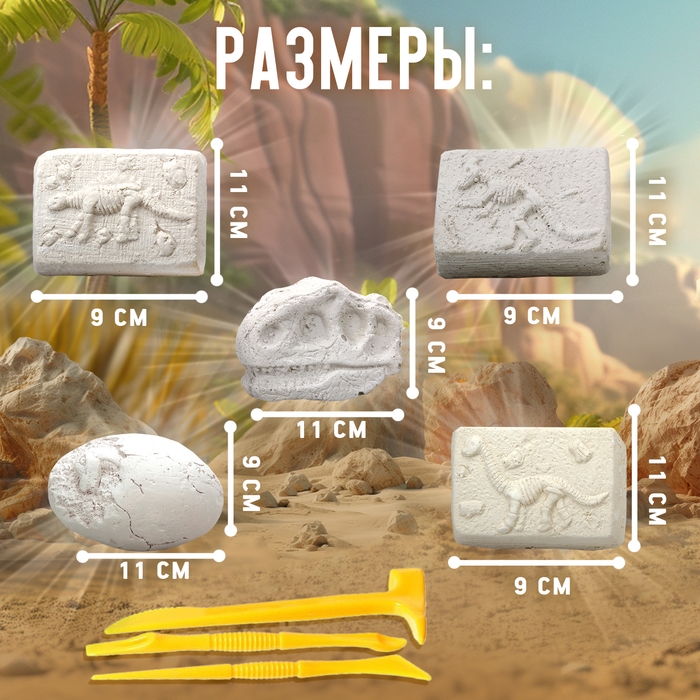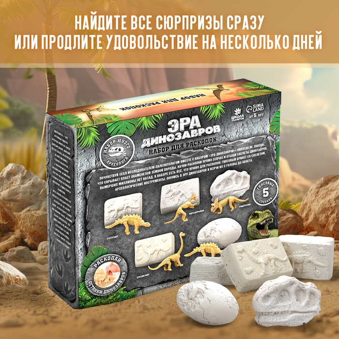 Набор для раскопок «Эра динозавров» позволит ребёнку почувствовать себя настоящим исследователем-палеонтологом, который разыскивает скелеты динозавров в окаменелой земной породе с помощью специальных инструментов. Желаем успехов в поисках!