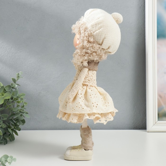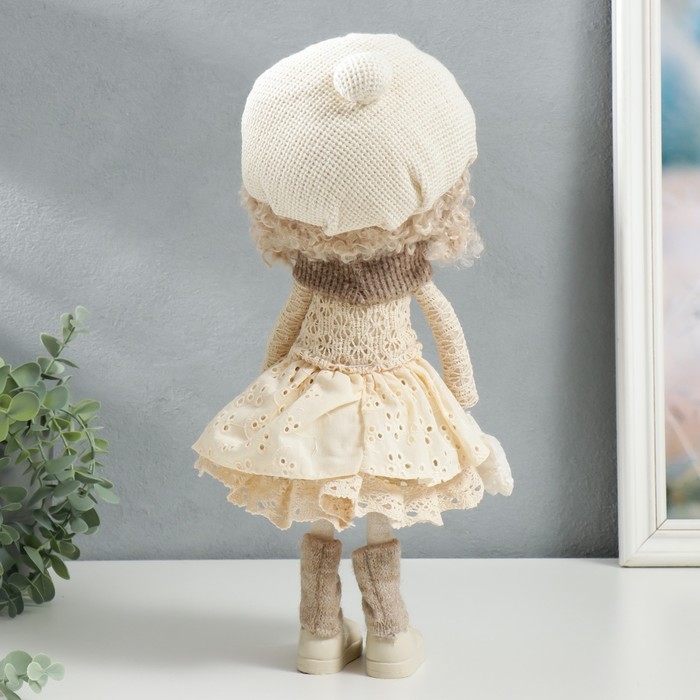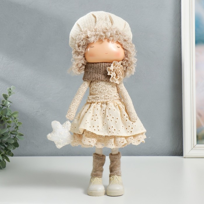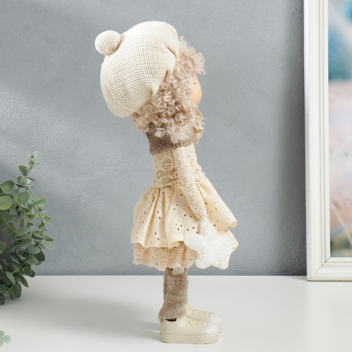Кукла интерьерная "Малышка в берете, в бежевом наряде, с цветком" 36,5х13х17 см