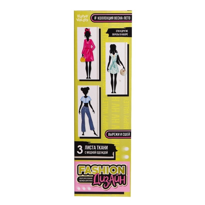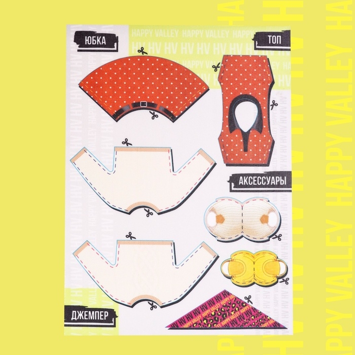 - В наборе есть три листа ткани с модной одеждой, которую начинающий стилист изготовит сам. На детали уже нанесены линии, по которым нужно вырезать и сшить их.
