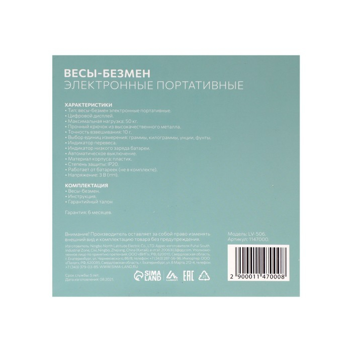 Весы-безмен Luazon LV-506, электронный, до 50 кг, точность до 10 г, подсветка, чёрный