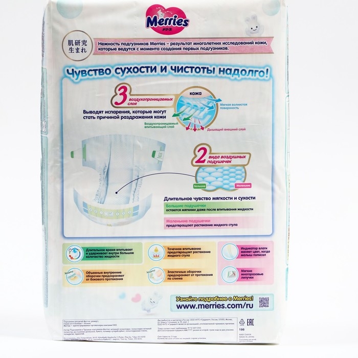 Подгузники отличаются превосходной впитываемостью, мягкостью и отменной воздухопроницаемостью. Весь подгузник покрыт мельчайшими порами, позволяющими испарениям выходить наружу, а благодаря внутреннему пористому слою, пропускающему в 3 раза больше воздуха, подгузник не прилипает к нежной коже ребёнка и хорошо удерживает жидкий стул, защищая кожу от раздражений.