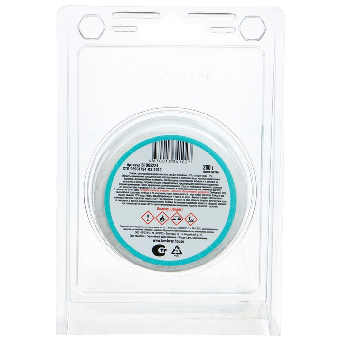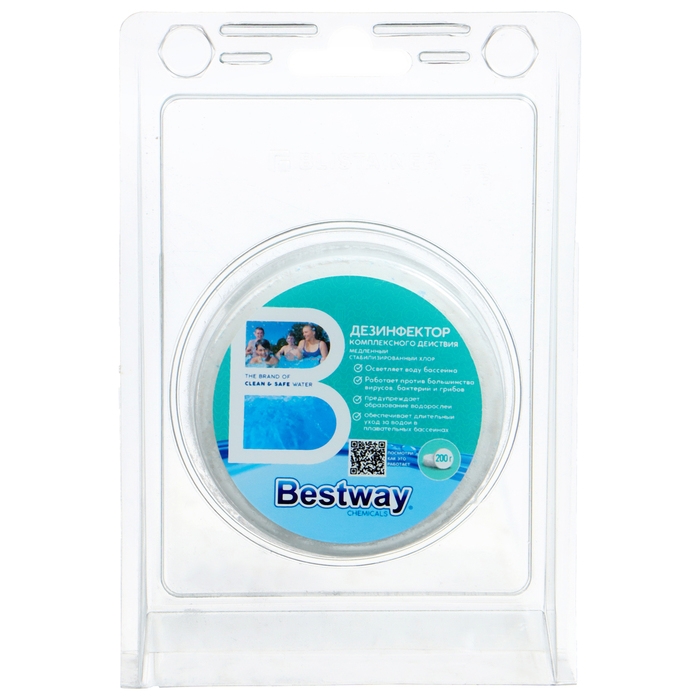 Дезинфектор комплексного действия Bestway длительно обеззараживает и осветляет воду частных плавательных бассейнов малого объёма. Бактерицидная, вирулицидная активность и действие на вегетативные формы спорообразующих микроорганизмов, предупреждает образование водорослей. Свободный хлор, выделяемый средством, устойчив к УФ-излучению, может использоваться в воде любой жёсткости.