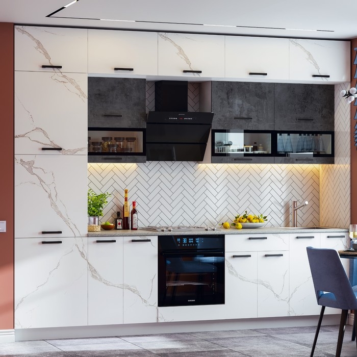 Кухня трехуровневая под потолок 3000 Техно, Мрамор белый/Бетон графит