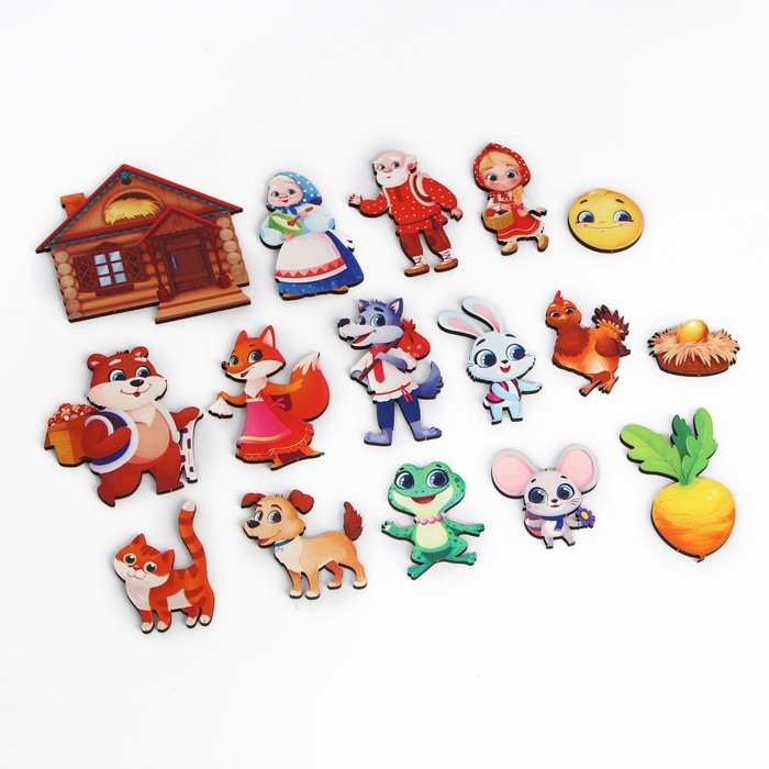 - В набор входит книга с 5 сказками внутри и фигурки персонажей к ним: «Колобок», «Курочка Ряба», «Маша и медведь», «Репка», «Теремок».