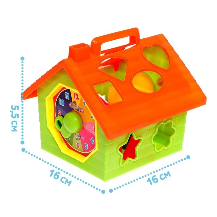 - Детали сортера — пронумерованные фигурки, а сам сортер выполнен в виде дома на подвижных колёсах.