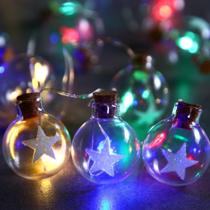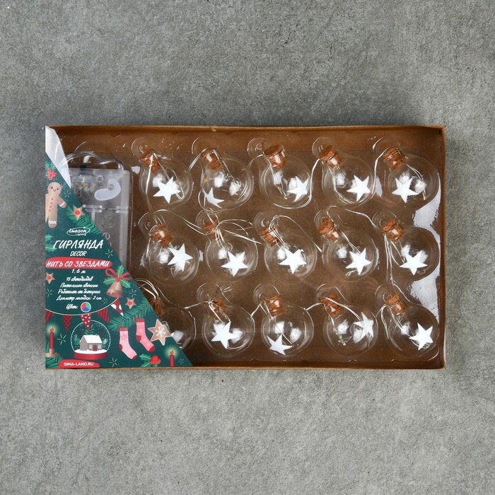 Гирлянда «Нить» 1.6 м с насадками «Шарики со звездой», IP20, серебристая нить, 15 LED, батарейки ААх2 (нет в комплекте), свечение мульти