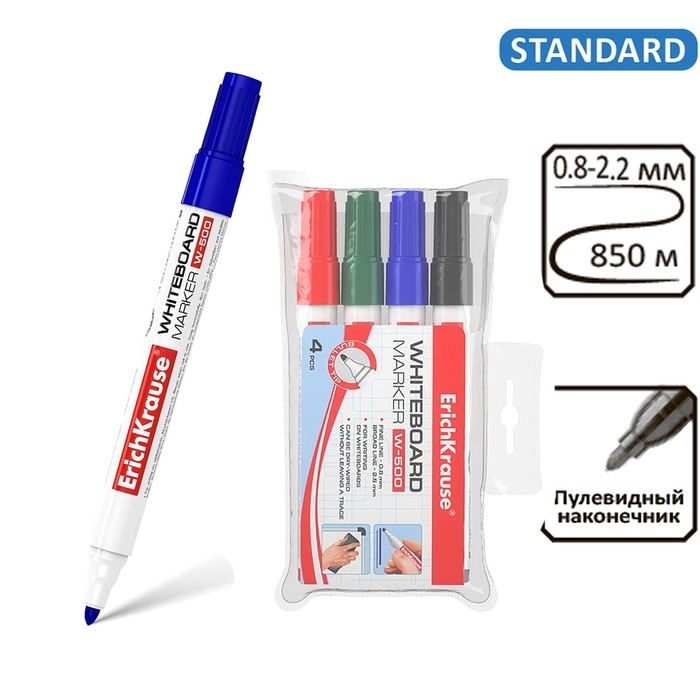 Набор маркеров для доски ErichKrause W-500, 0.8-2.5 мм, для письма на досках сухого стирания, чернила на спиртовой основе без ксилола