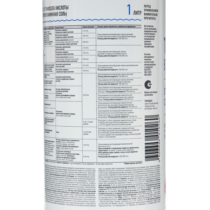 Эффективно уничтожает все виды нежелательной растительности. Мощный эффект, отличный результат.Торнадо является очень эффективным средством для борьбы с сорной растительностью. Он относится к категории гербицидов сплошного действия, эффективно избавляя дачные участки, виноградники и сады от однолетних и многолетних сорных растений. Это универсальный уничтожитель, который проникает в сорняки через листья и стебли, после чего проникая в их корневую систему, в результате растение полностью гибнет.