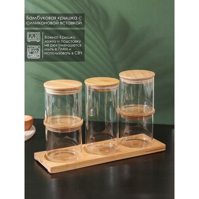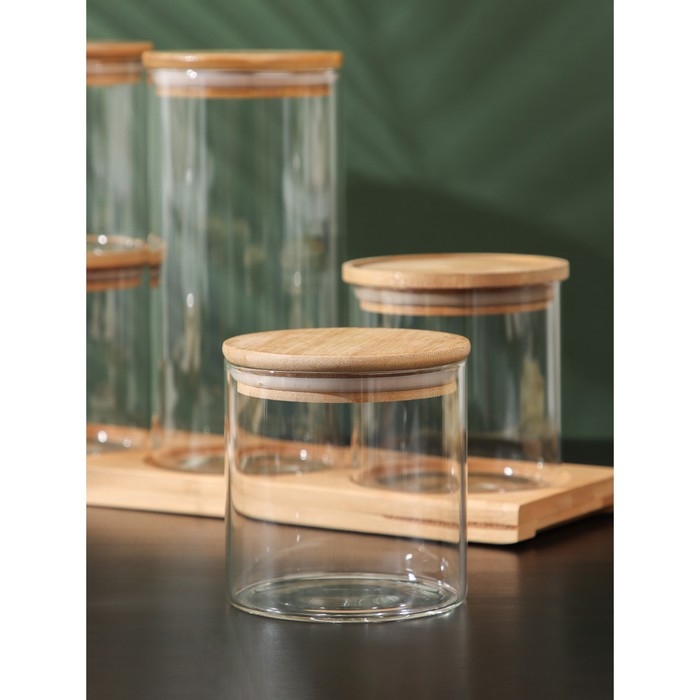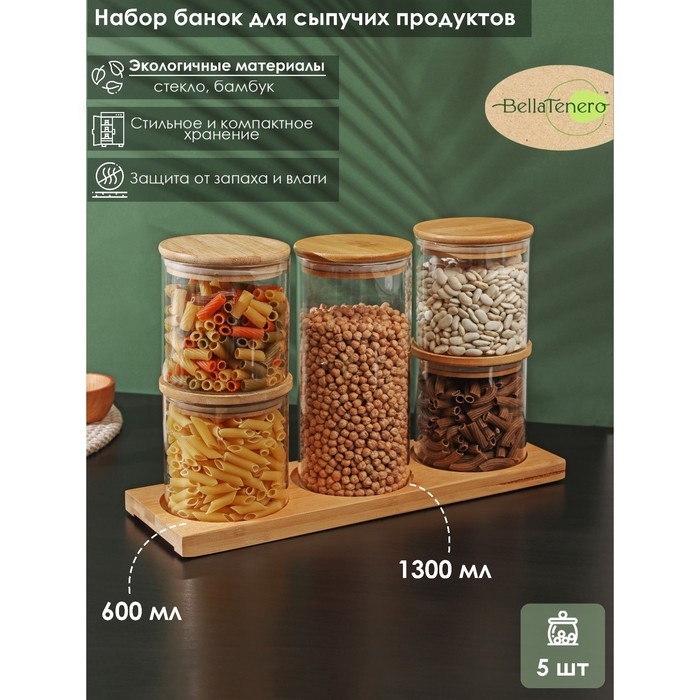 Банки стеклянные для хранения сыпучих продуктов BellaTenero «Эко», 5 предметов: 4 банки 600 мл, 1 банка 1300 мл, с бамбуковой крышкой