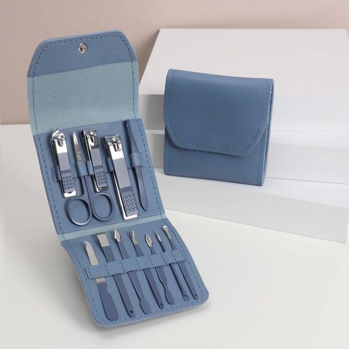 Набор маникюрный, 12 предметов, в футляре, цвет синий