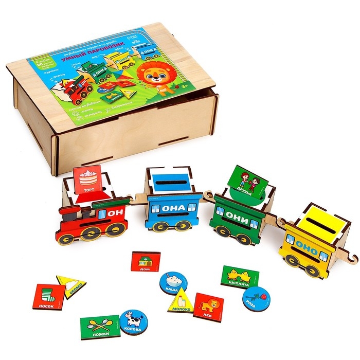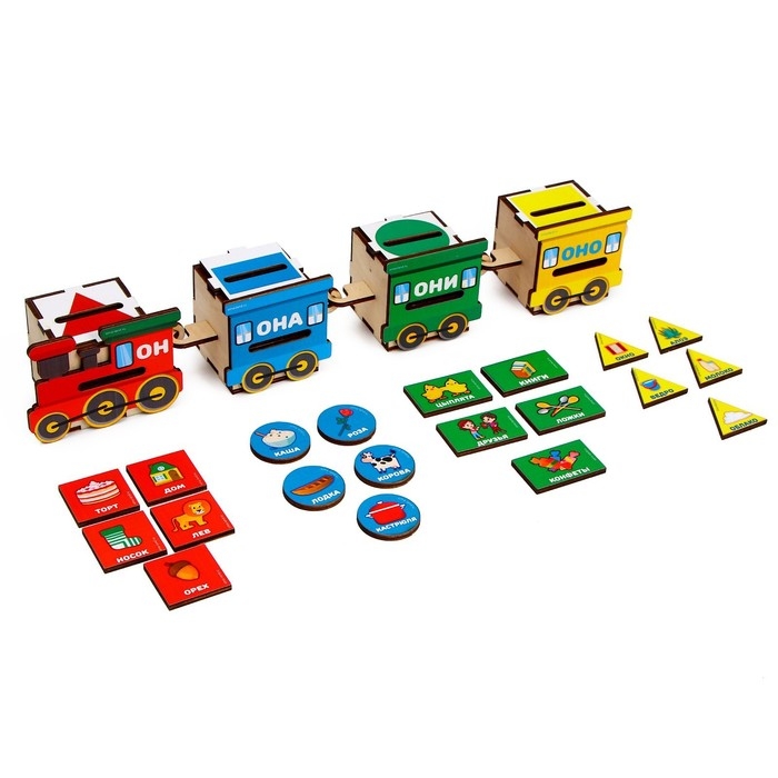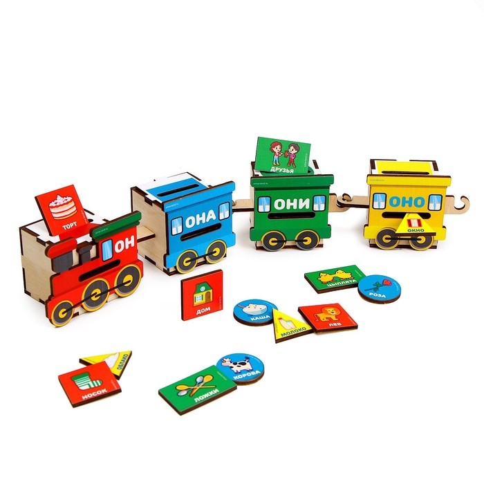 - Поиграйте с самим паровозиком как с сортером: пусть малыш опускает фишки в соответствующий вагон, сначала ориентируясь только на цвет и форму. Затем объясните, что в красном вагончике все слова мужского рода, в синем — женского, в жёлтом — среднего, а в зелёном — слова во множественном числе.