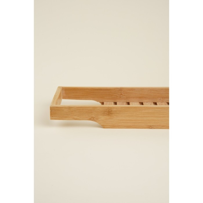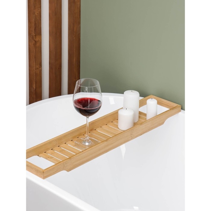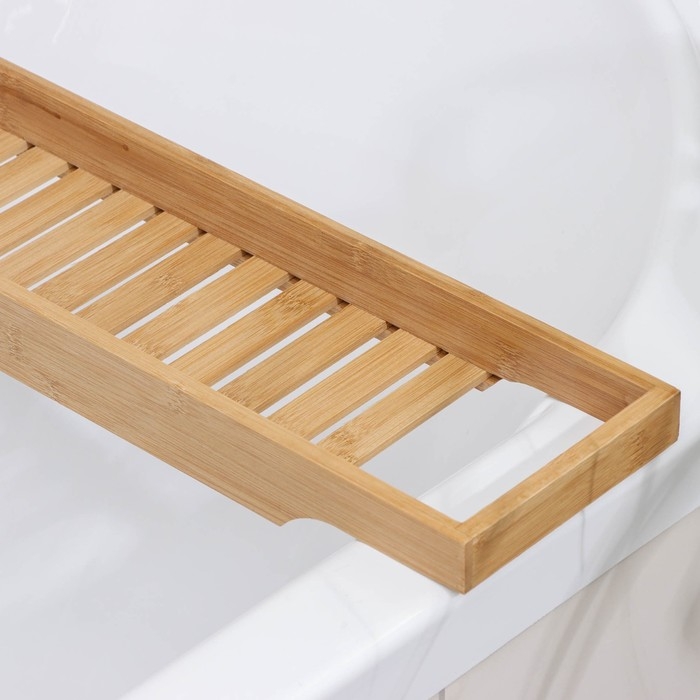 Эта стильная и функциональная полка для ванной комнаты, выполненная из натурального бамбука, станет неотъемлемой частью вашего домашнего СПА-уголка. С её помощью вы сможете удобно разместить все необходимые принадлежности для ванной или организовать уютный вечер с книгой и бокалом вина.