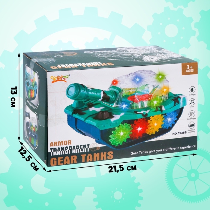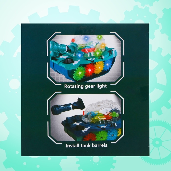 Танк «Шестерёнки» создан для маленьких любителей техники. Он самостоятельно катается по полу благодаря специальному моторчику на батарейках. Во время игры кузов светится, играет весёлая музыка и крутятся шестерёнки.