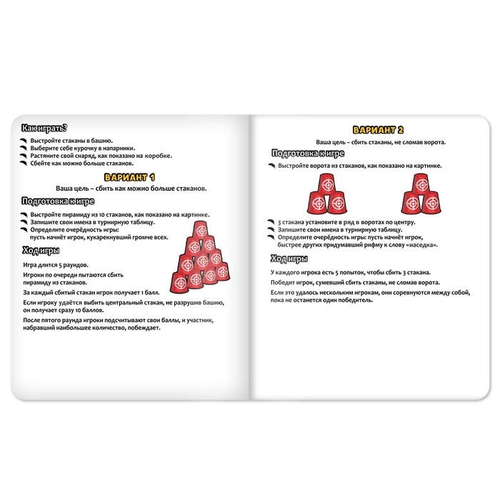 В двух первых вариантах игрокам предстоит сбивать стаканчики курочками, стреляя ими как резинкой. В третьем варианте необходимо играть шариком.