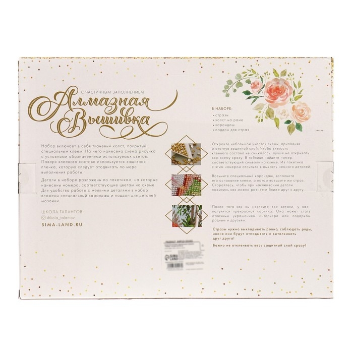 Часть изображения предстоит заполнить стразами, другая часть напечатана на холсте-основе. Поэтому набор подойдёт для тех, кто впервые пробует свои силы в этой технике или любит быстро добиваться результата.