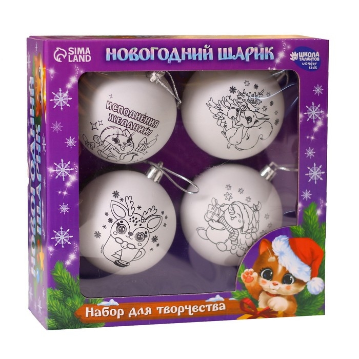 Ёлочные шары под раскраску на новый год «Чудесный подарок», 4 шт, d=7см, новогодний набор для творчества