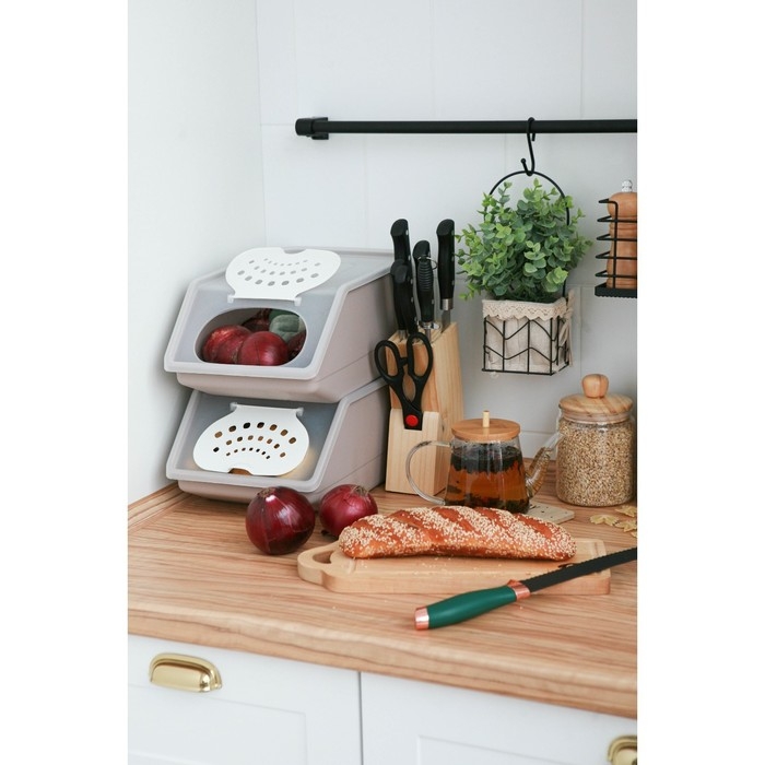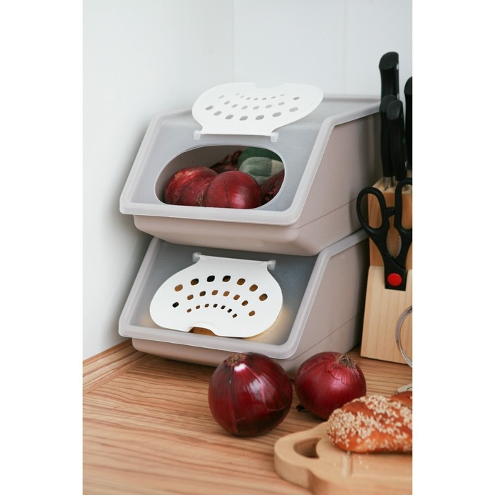 Контейнер для хранения овощей предназначен для длительного хранения овощей. Благодаря системе вентиляции овощи в ящике долго остаются свежими, полезными, а также это позволяет избежать их гниения и появления плесени. Поставьте контейнеры друг на друга, чтобы сэкономить место на кухне. Компактный ящик для хранения позволяет поместить его на кухню, балкон, лоджию или дачу.