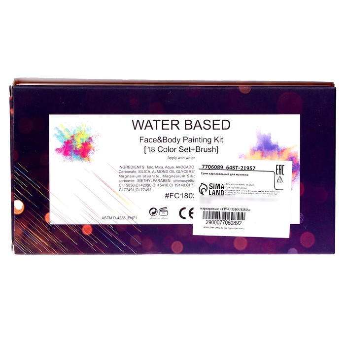 Аквагрим профессиональный для лица и тела, 18 цветов, с 2 кисточками