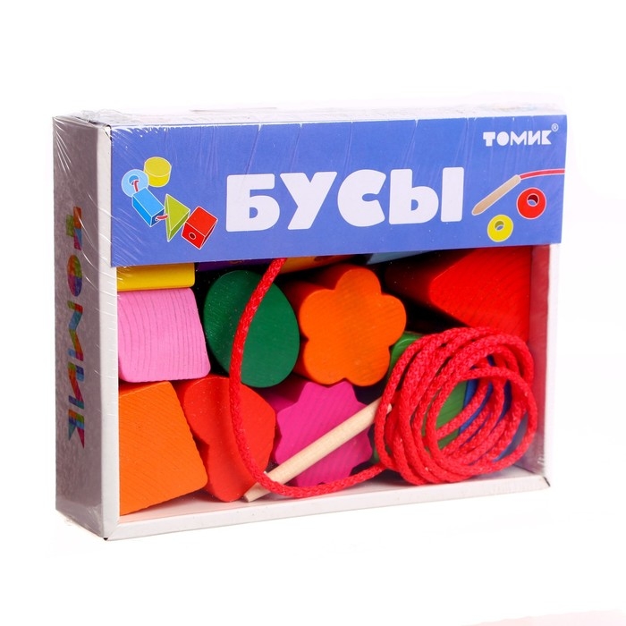 Логический игровой набор бус изготовлен из сосны и состоит из 15 деталей, окрашенных водными экологичными красками.