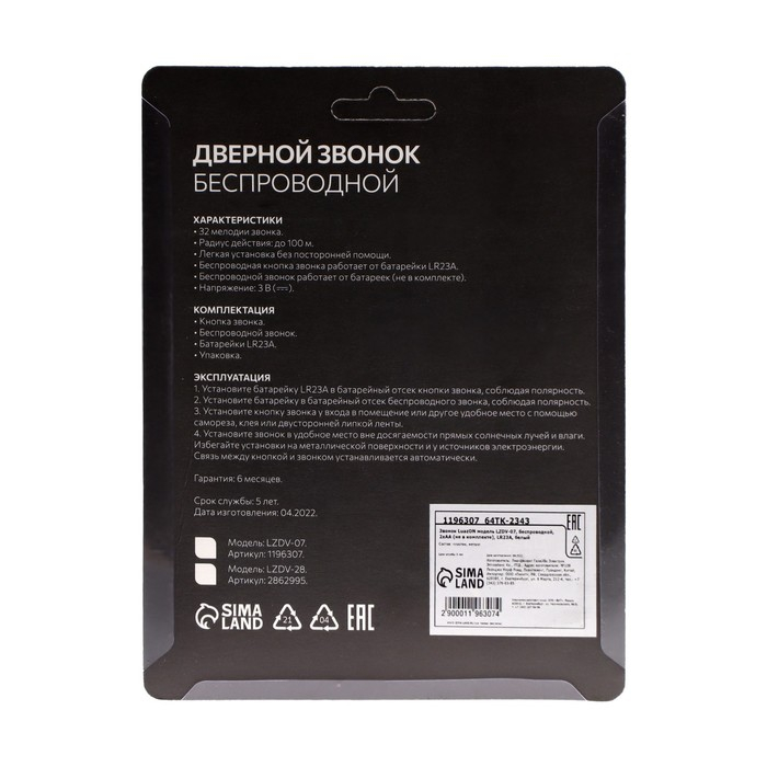 Звонок Luazon LZDV-07, беспроводной, 2хAА (не в комплекте), LR23A, белый