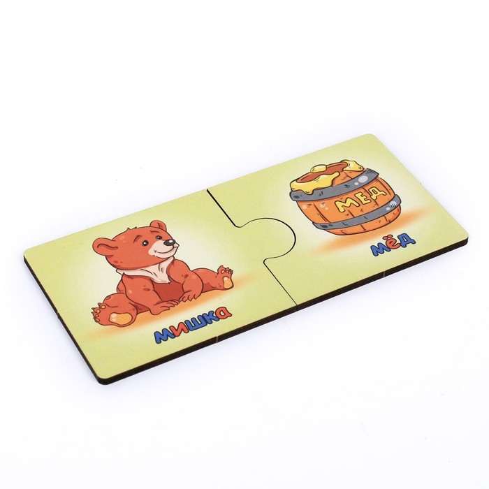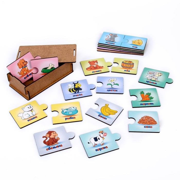 - Задача ребёнка — соединить две половинки пазла, подобрав каждому персонажу соответствующее лакомство.