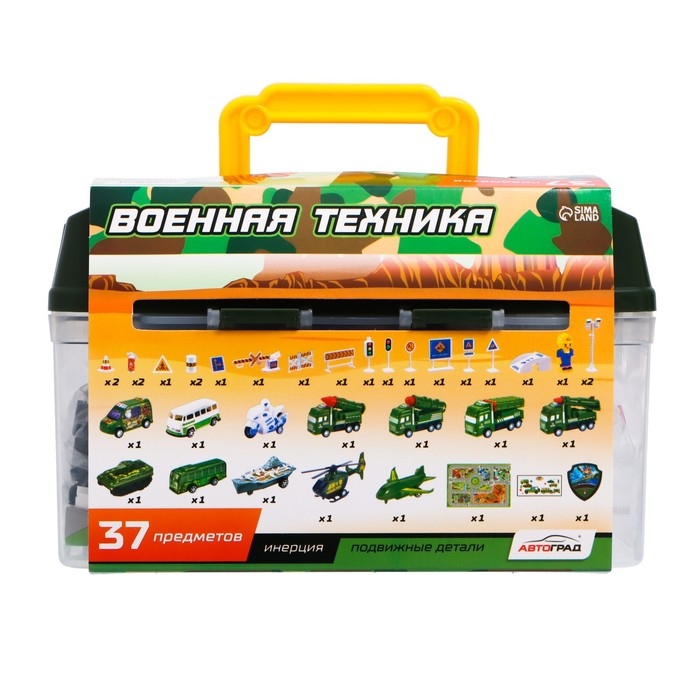 Набор игровой «Военная техника», 37 предметов: 12 инерционных машинок, дорожные знаки, игровое поле, наклейки
