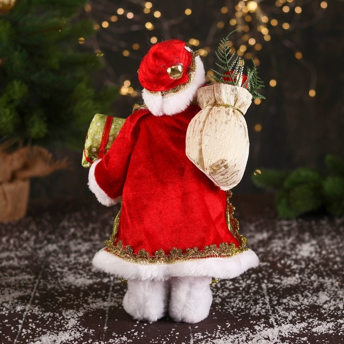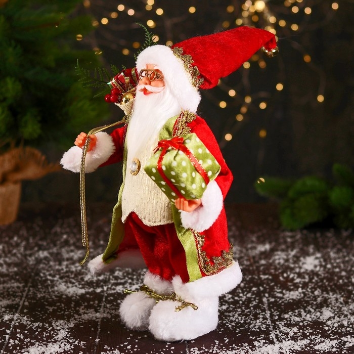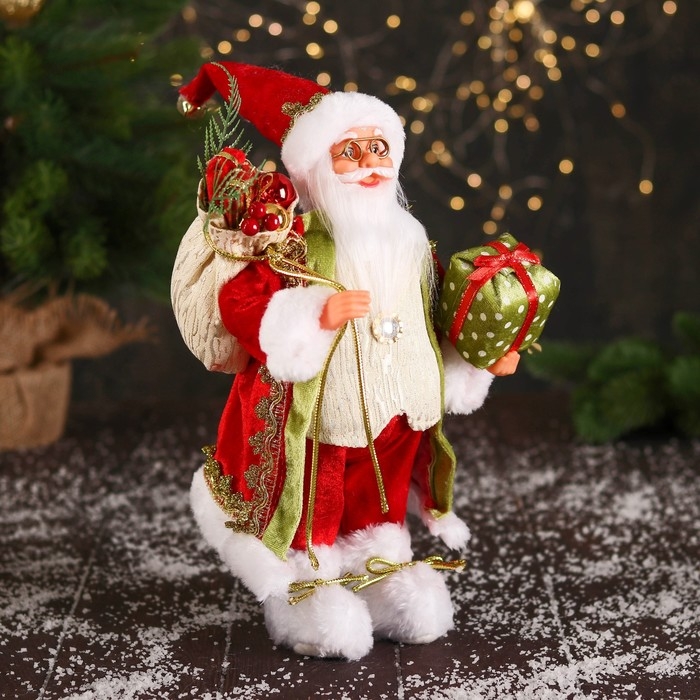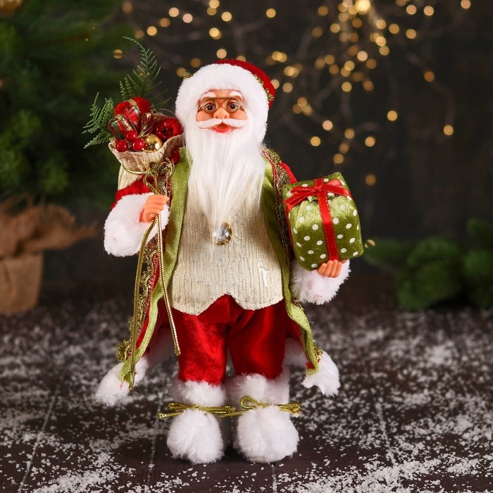 Дед Мороз "В колпачке и с коробкой подарков в горошек" 30 см, красно-зелёный