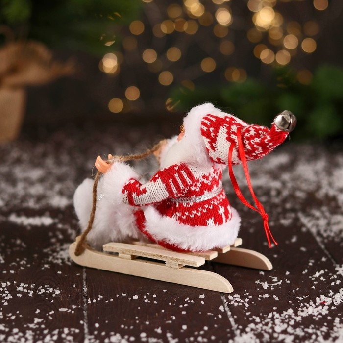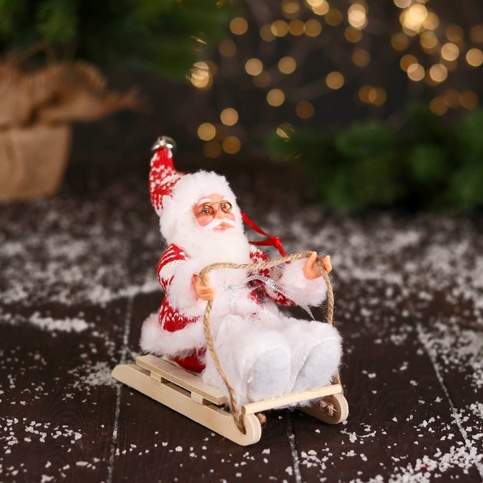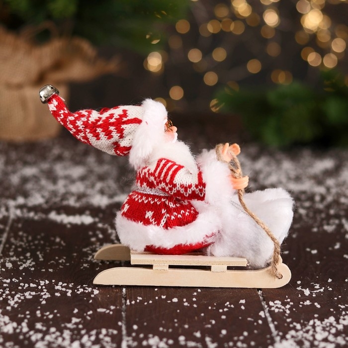 Дед Мороз "В костюмчике с узорами и меховых ботиночках, на санях" 13 см, красно-белый