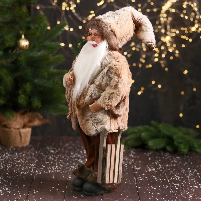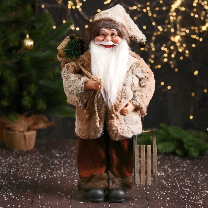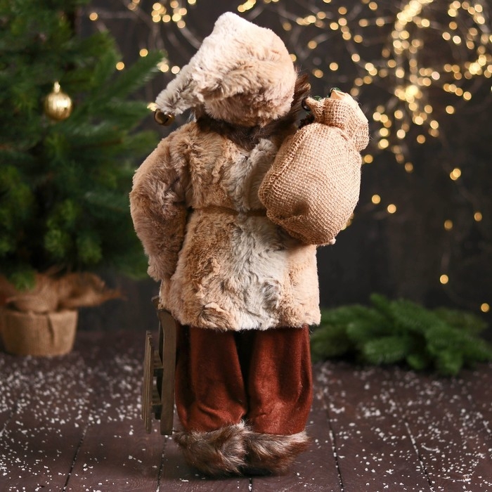 Дед Мороз "В меховом колпачке, подарками и санками" 47 см, коричневый