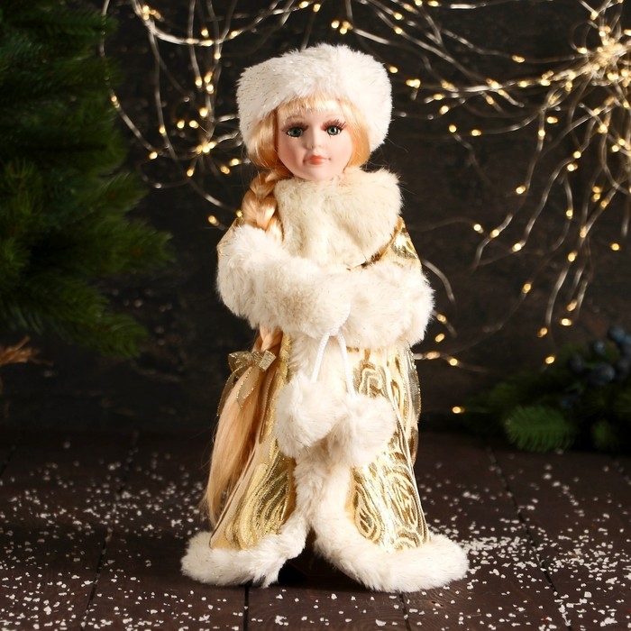 Снегурочка "В муфте с меховыми бомбошками" 33 см, золотисто-белый