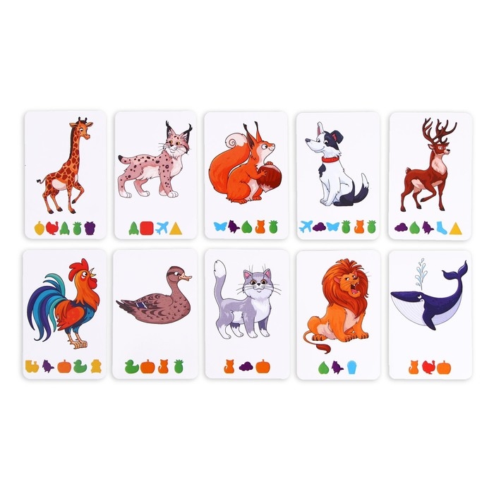 - В набор входит 20 карточек. На них нарисованы разные предметы, а подпись к ним зашифрована фигурками. Этим фигурам по цвету и форме соответствуют деревянные плашки с буквами.