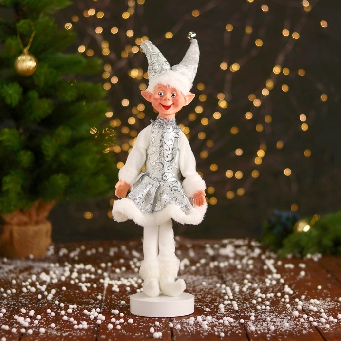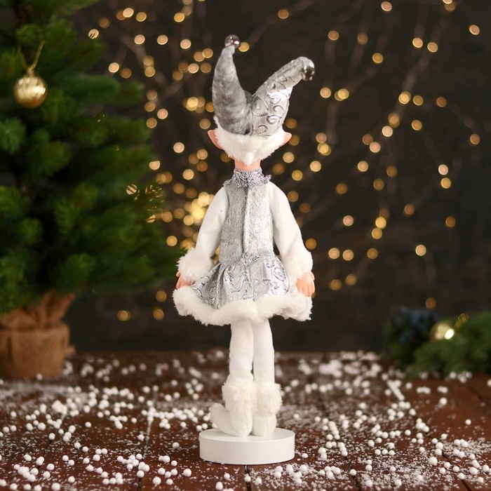 Новогодний шут "В узорном платье с мехом" 30 см, серебристо-белый