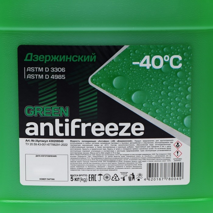 Антифриз «Дзержинский» Green предназначен для охлаждения любых типов двигателей внутреннего сгорания. Обеспечивает эффективную защиту системы охлаждения от замерзания, коррозии и перегрева. Произведен из высококачественного этиленгликоля с добавлением современного комбинированного пакета присадок. Предотвращает образование отложений в охлаждающих каналах двигателя и радиатора, продлевает срок службы водяного насоса. Антифриз «Дзержинский» GREEN рекомендован для современных отечественных и импортных автомобилей. Продукт готов к применению. Применять при температуре окружающей среды не ниже -40°С.