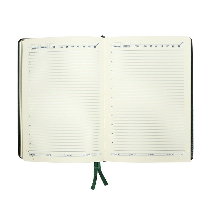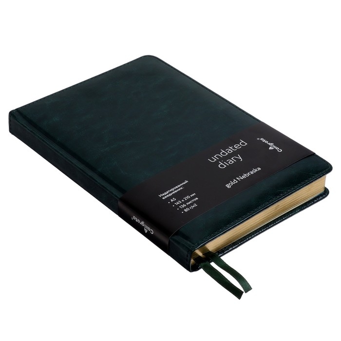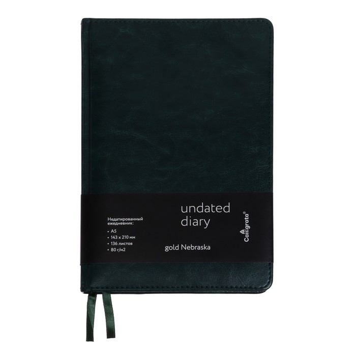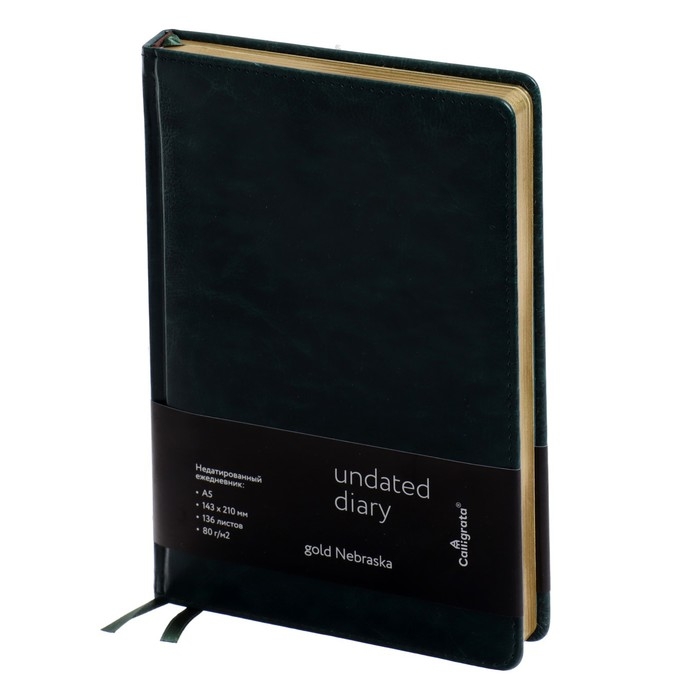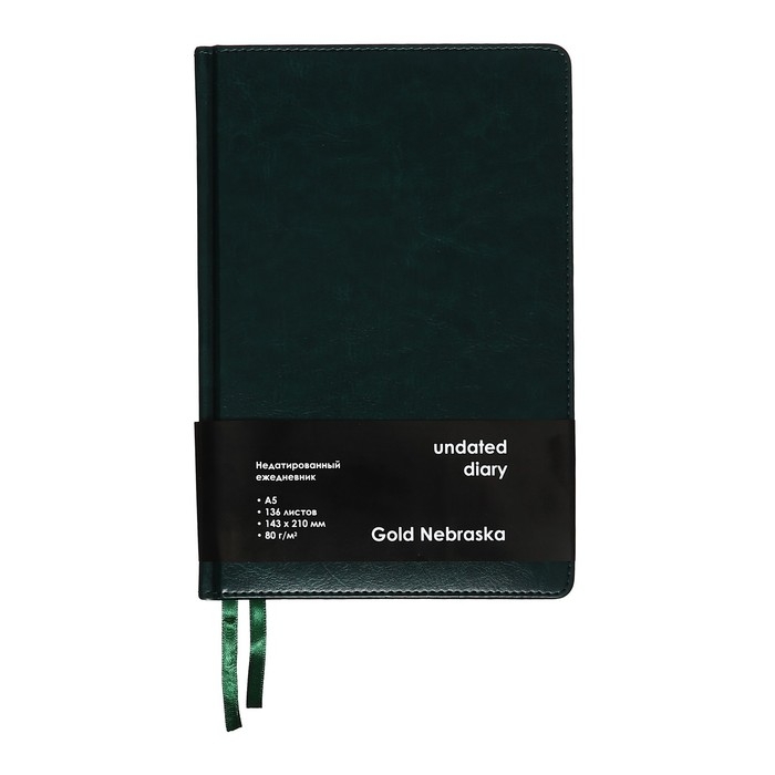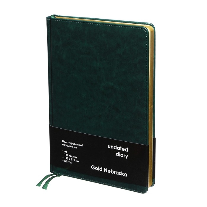 Ежедневник НЕдатированный А5, 136 листов в линейку, кожзам "Небраска", золотой срез, зеленый