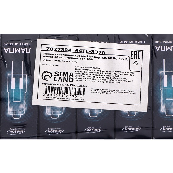 Лампа галогенная Luazon Lighting, G9, 60 Вт, 220 В, набор 10 шт.