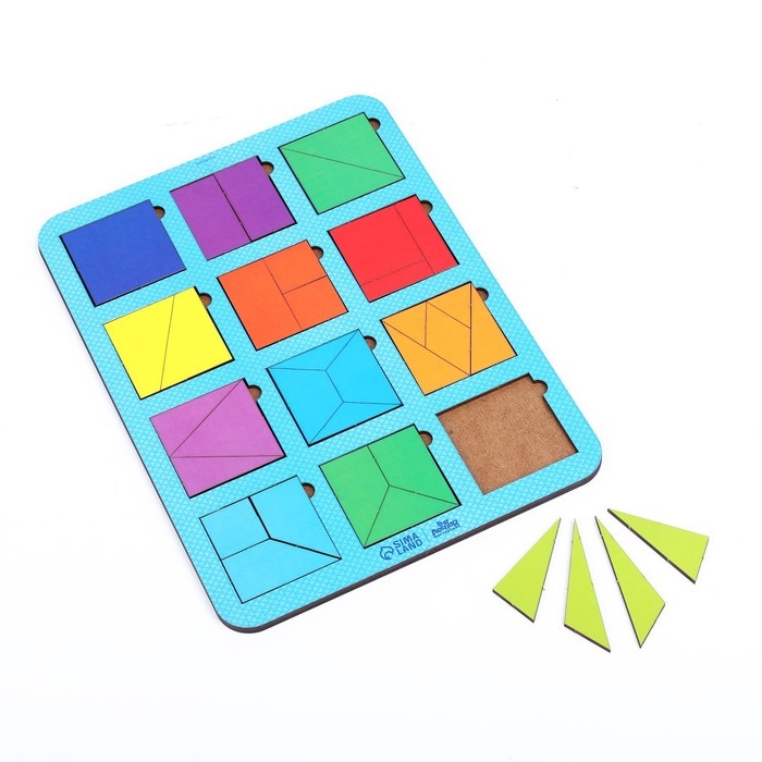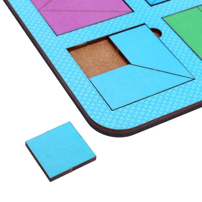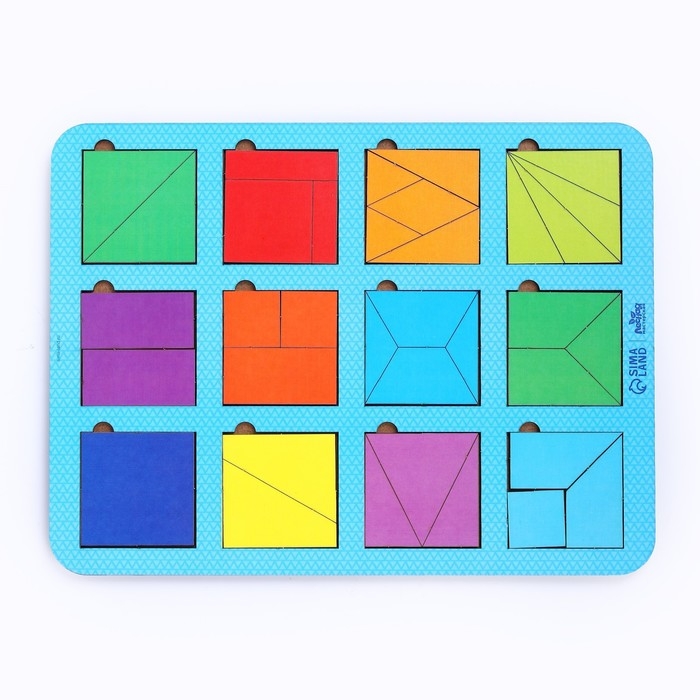 - Задача ребёнка — в процессе игры с помощью фигур сложить узор в форме квадрата таким образом, чтобы заполнить всё пространство в рамке.