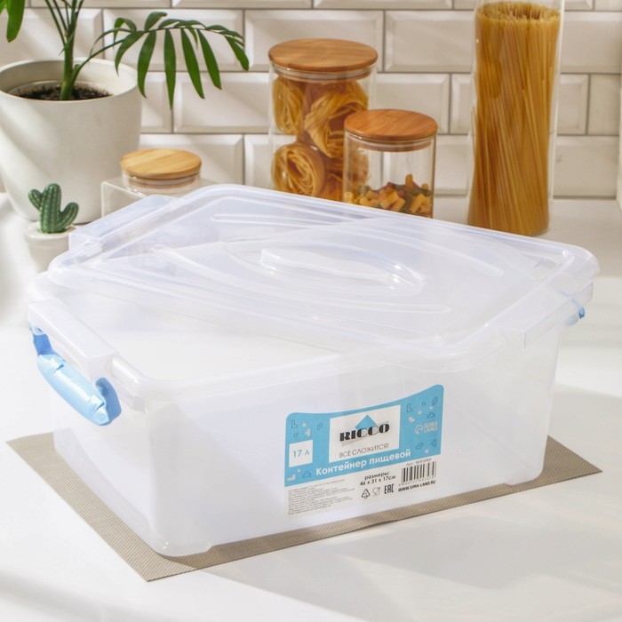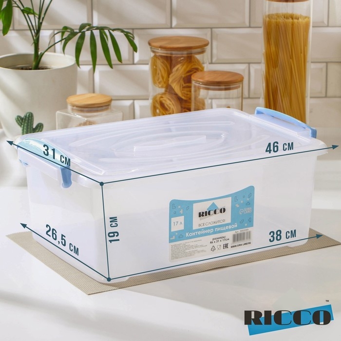 Контейнер пищевой RICCO, 17 л, 46×31×17 см, прямоугольный, цвет прозрачный, ручки голубые