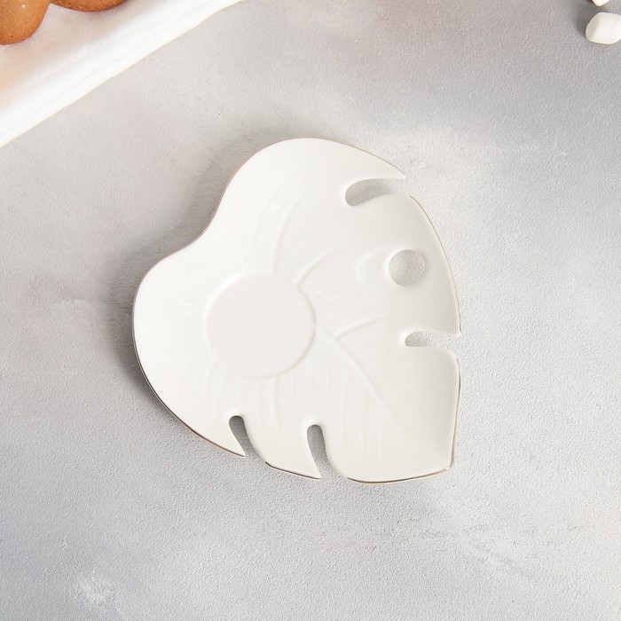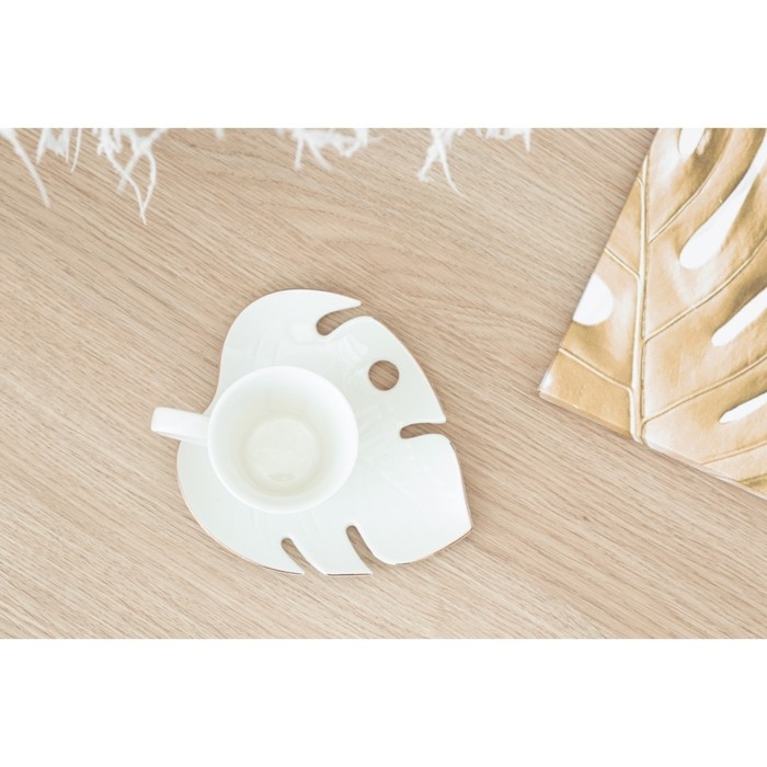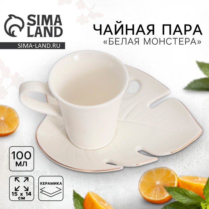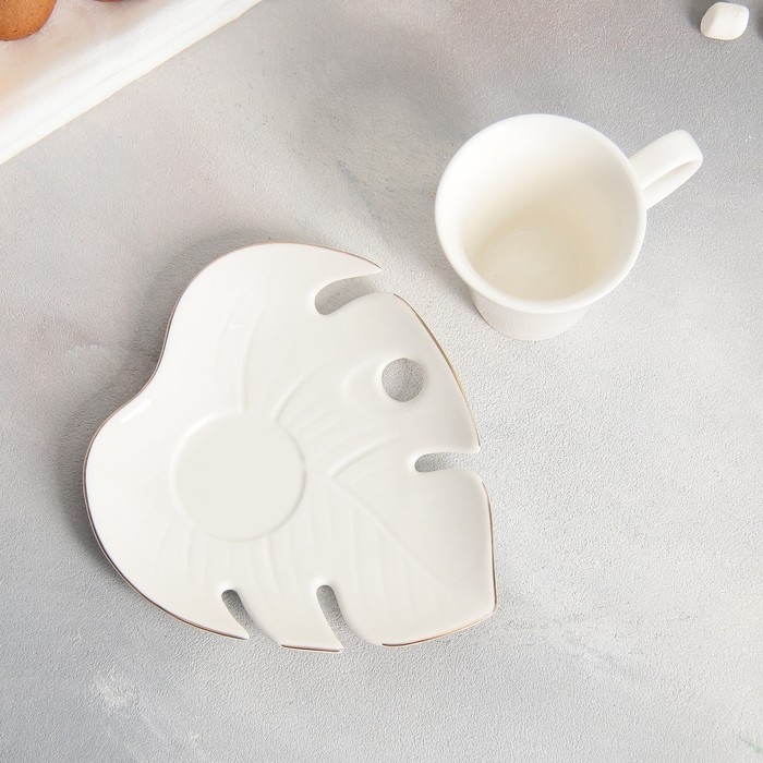 Чайная пара керамическая «Белая монстера», кружка 100 мл, блюдце 15х14 см, цвет белый