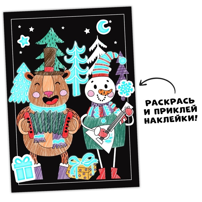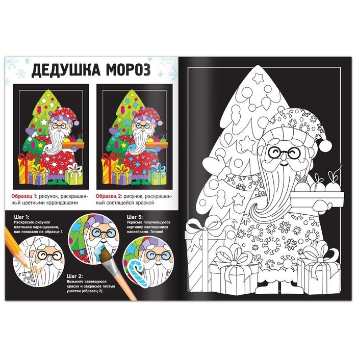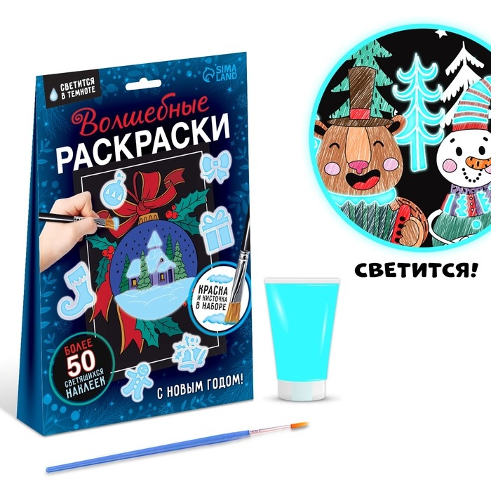 Набор для волшебного творчества увлечёт ребёнка и взрослого и позволит провести вечер творчески. В книге вы найдёте 6 картинок для раскрашивания, кисть, светящуюся краску и много светящихся наклеек.