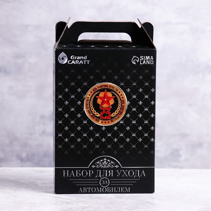 Подарочный набор для ухода за авто "23 Февраля" Military, набор автохимии: силиконовая смазка 400 мл, полироль пластика 400 мл, очиститель салона 400 мл, чернитель шин 400 мл + микрофибра