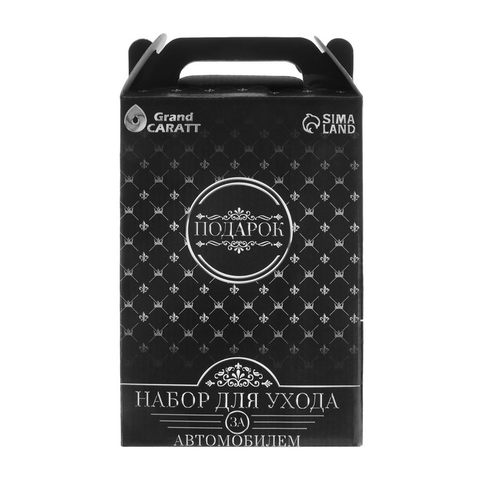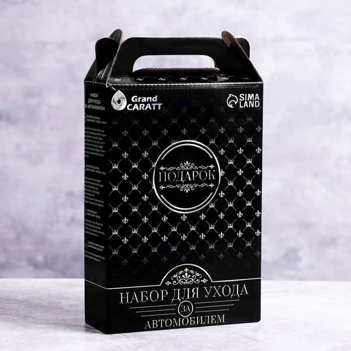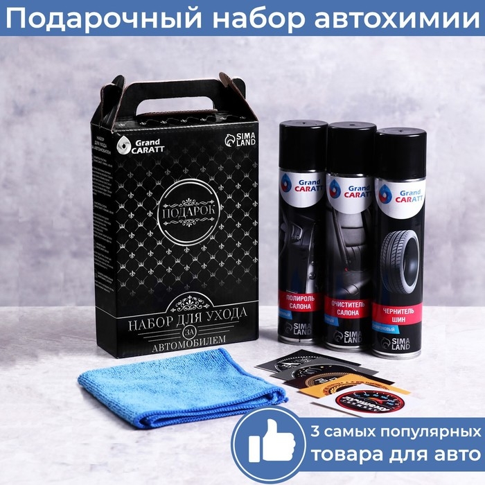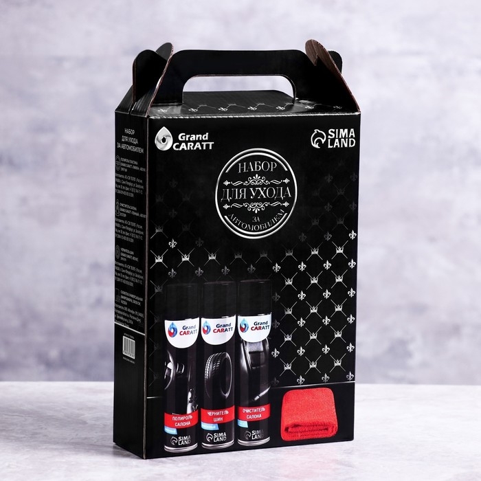 Подарочный набор Grand Caratt для ухода за авто, универсальный: полироль салона 400 мл, очиститель салона 400 мл, чернитель шин 400 мл, микрофибра