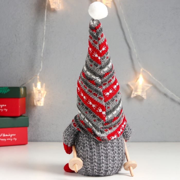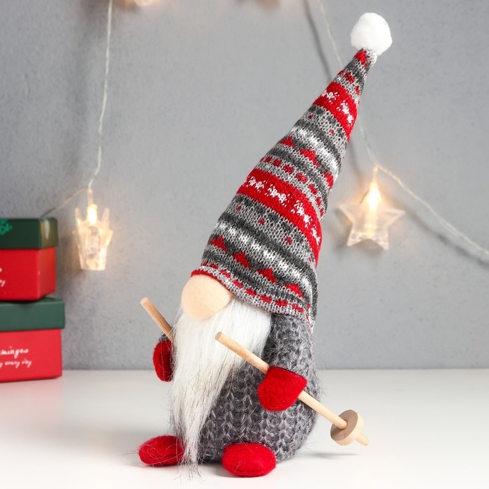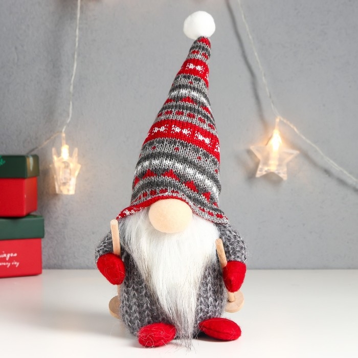 Кукла интерьерная "Дед Мороз с лыжными палками, серый колпак с узорами" 27х12х8 см