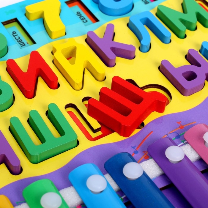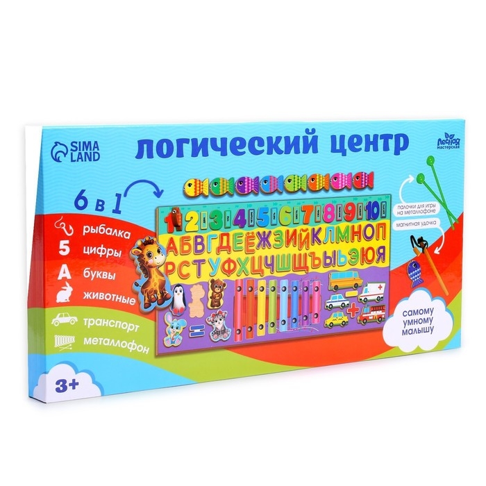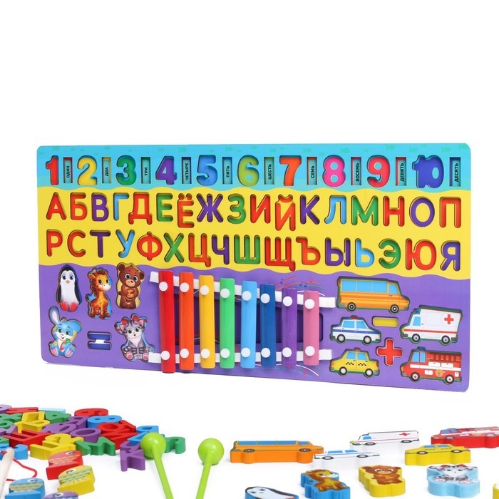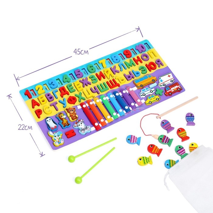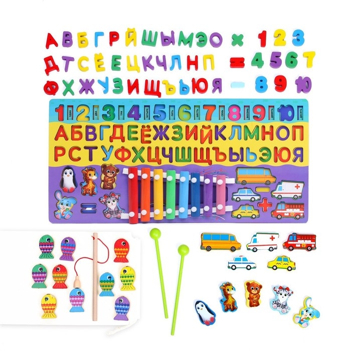 Эта игрушка создана для первых занятий с малышом. Играя с ней, ребёнок познакомится с буквами и цифрами. Магнитная рыбалка поможет потренировать моторику и координацию движений, а металлофон — слуховое восприятие.